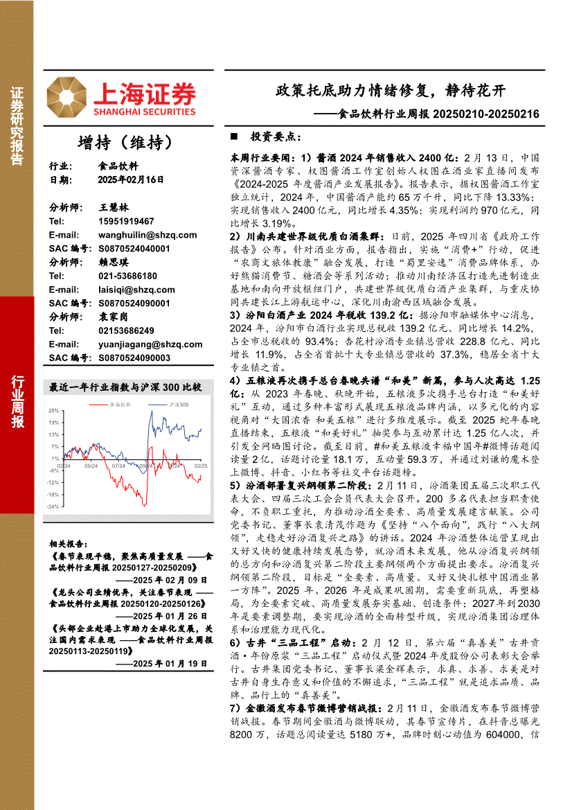食品饮料行业:上海证券-食品饮料行业周报:政策托底助力情绪修复,静待花开-250216