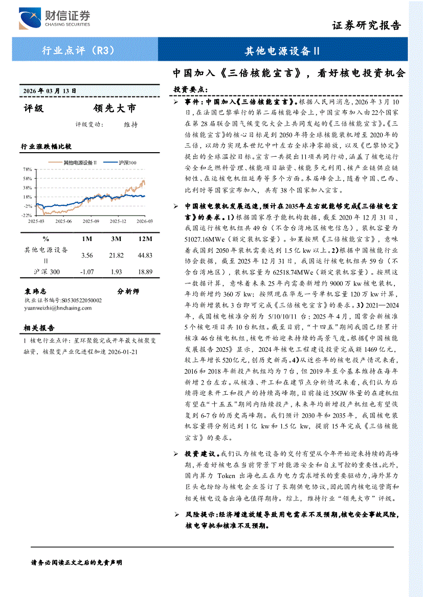其他电源设备行业:财信证券-其他电源设备Ⅱ行业点评(R3):中国加入《三倍核能宣言》,看好核电投资机会-260313