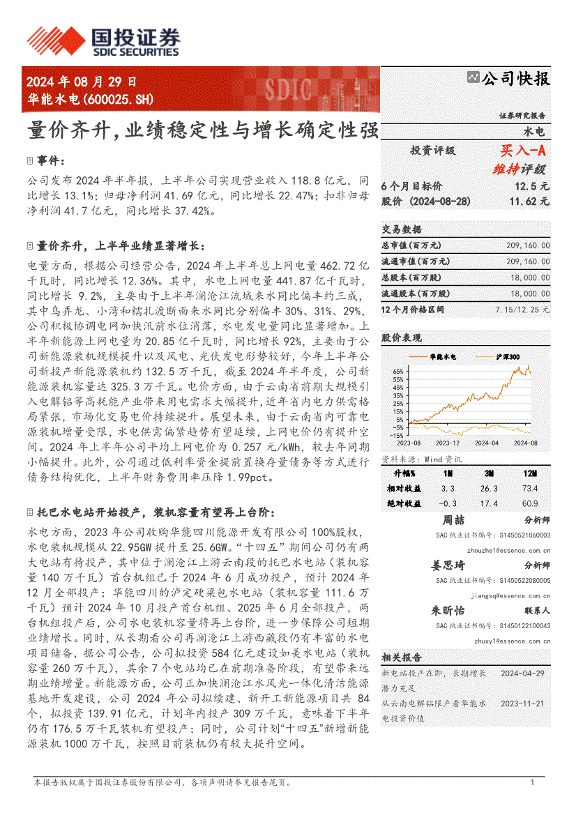 华能水电:国投证券-华能水电-600025-量价齐升,业绩稳定性与增长确定性强-240829