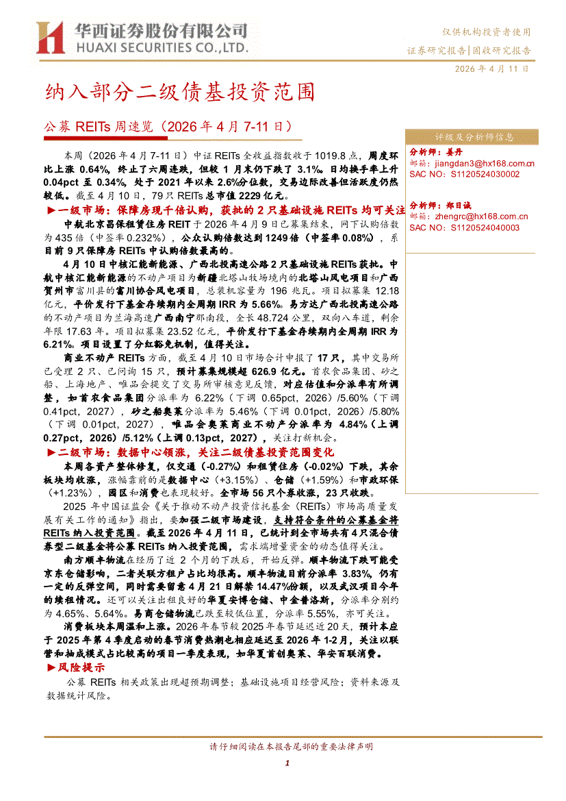 华西证券-公募REITs周速览(2026年4月7~11日):纳入部分二级债基投资范围-260411