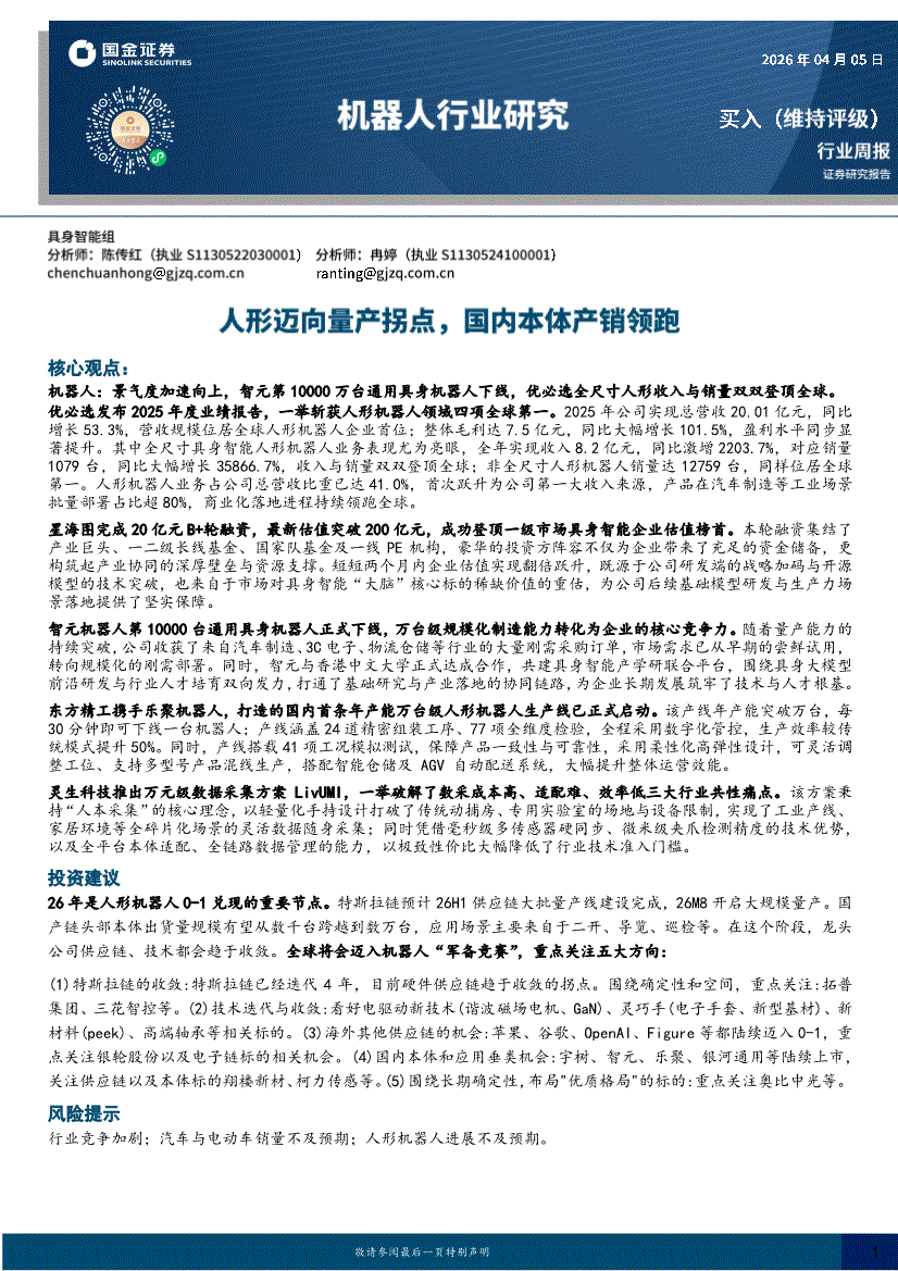 机器人行业:国金证券-机器人行业周报:人形迈向量产拐点,国内本体产销领跑-260405