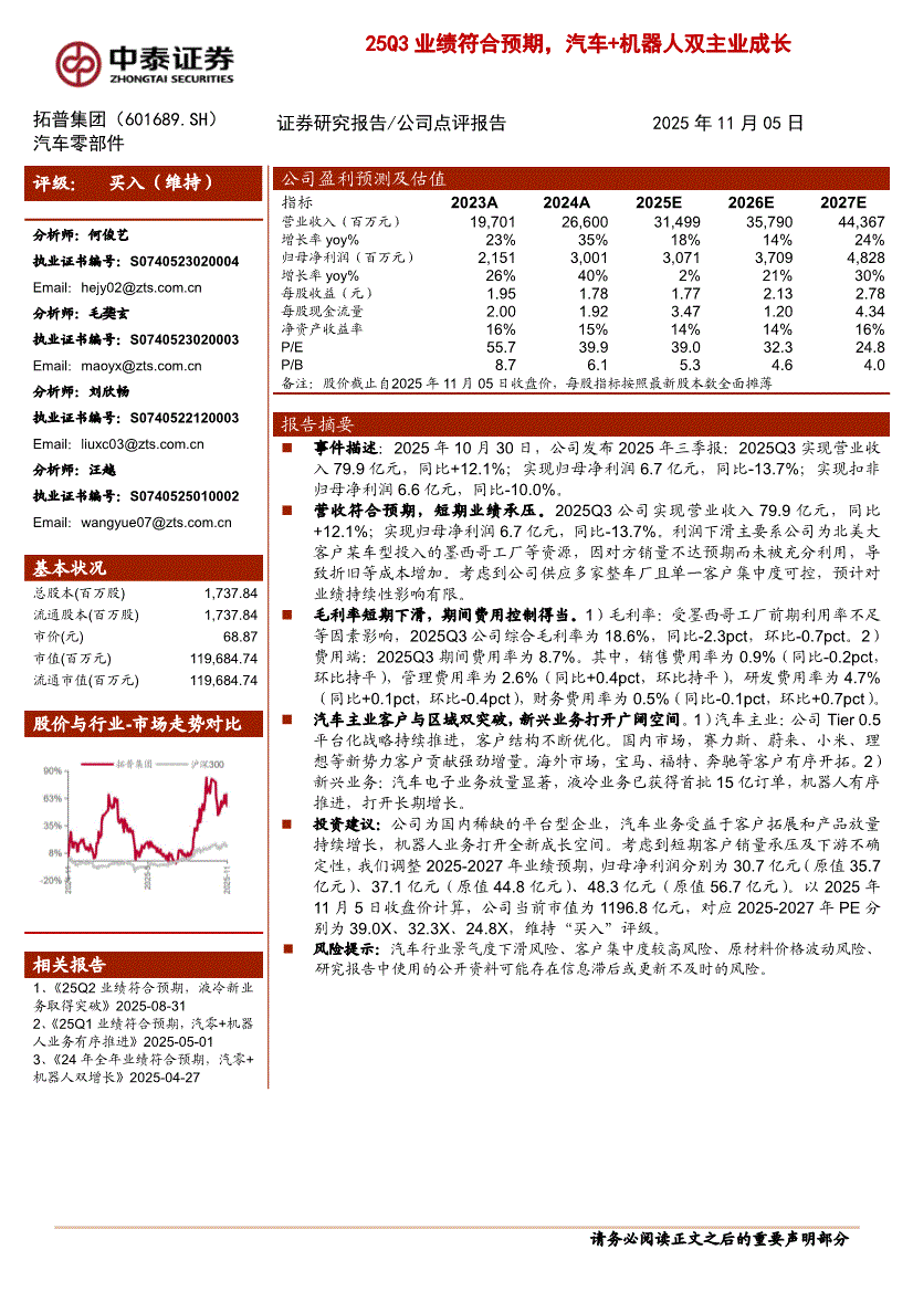 拓普集团:中泰证券-拓普集团-601689-25Q3业绩符合预期,汽车+机器人双主业成长-251105