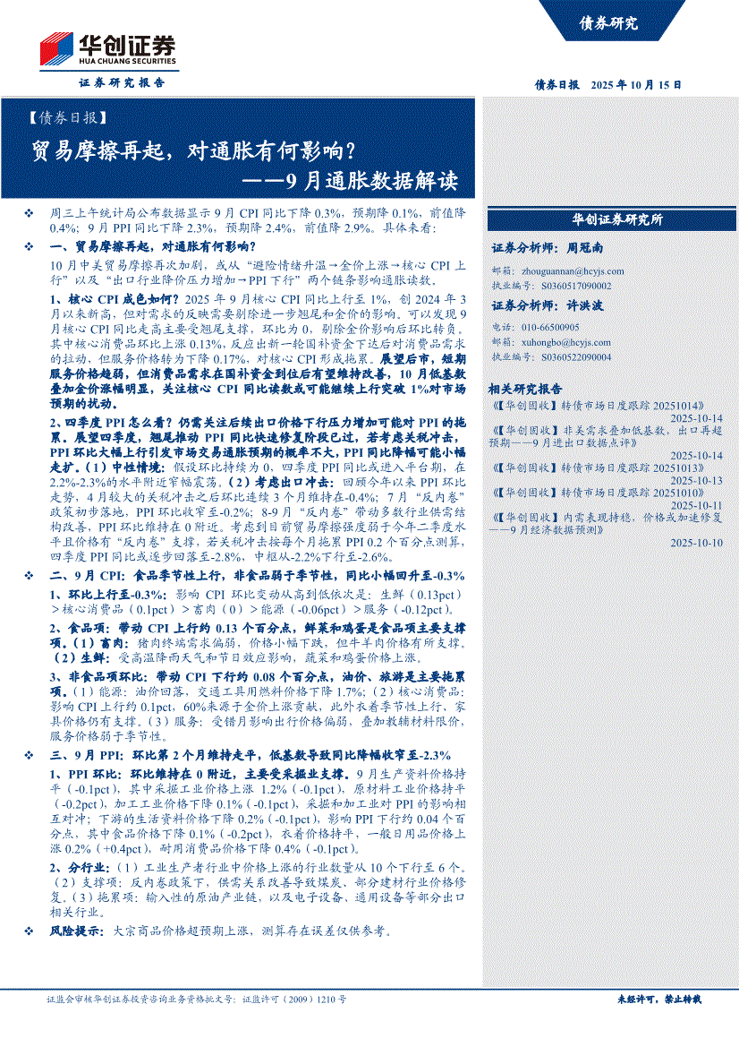华创证券-【债券日报】9月通胀数据解读:贸易摩擦再起,对通胀有何影响?-251015