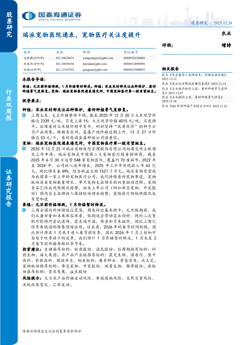 农业:国泰海通证券-农业:瑞派宠物医院递表,宠物医疗关注度提升-251228