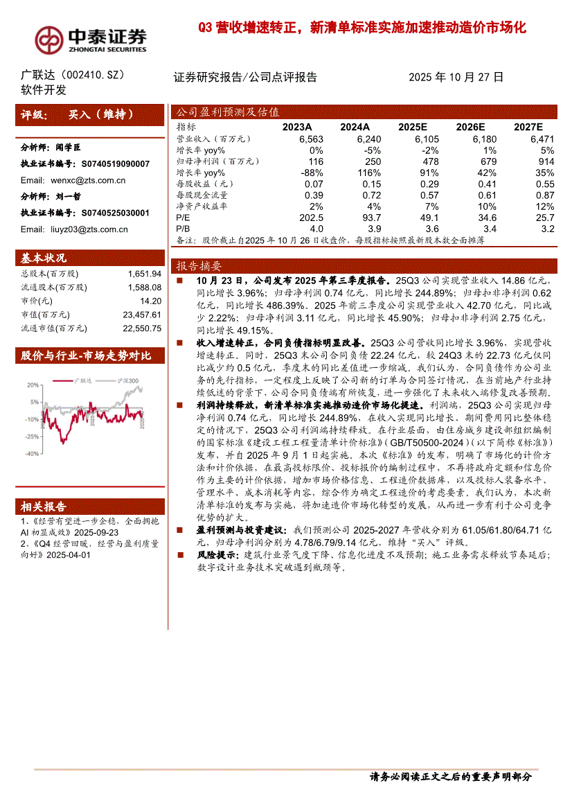 广联达:中泰证券-广联达-002410-Q3营收增速转正,新清单标准实施加速推动造价市场化-251027