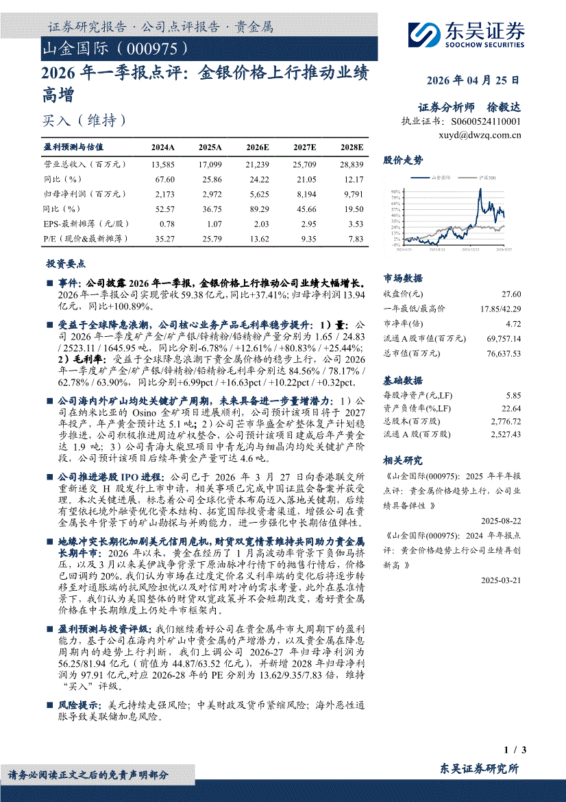 山金国际:东吴证券-山金国际-000975-2026年一季报点评:金银价格上行推动业绩高增-260425