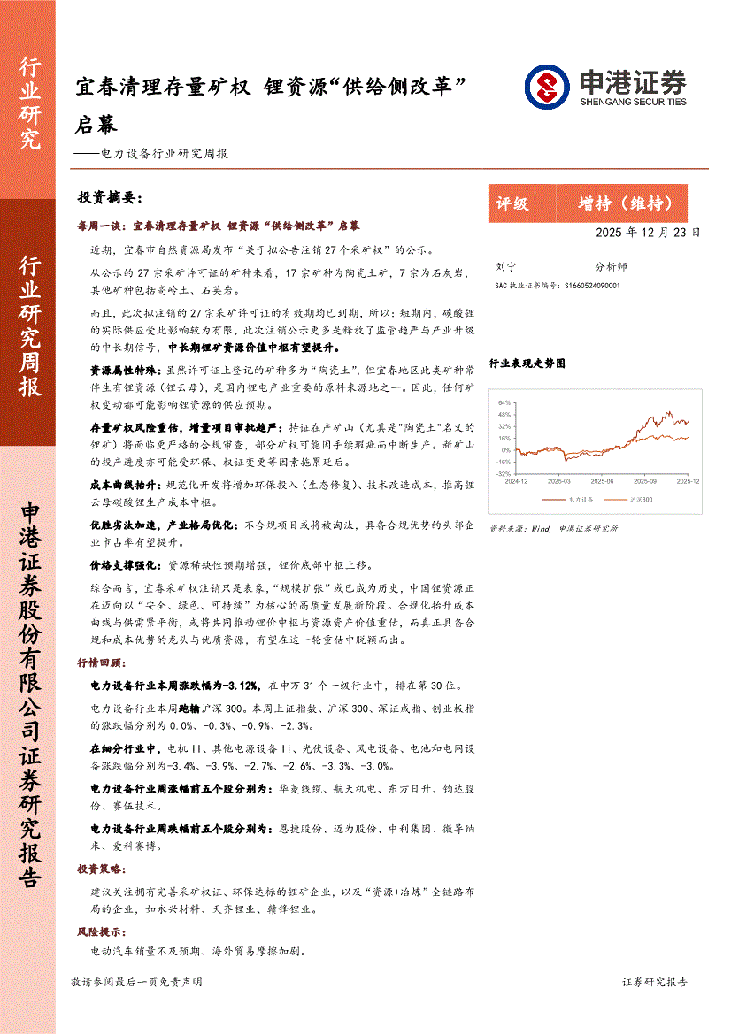 电力设备行业:申港证券-电力设备行业研究周报:宜春清理存量矿权,锂资源“供给侧改革”启幕-251223