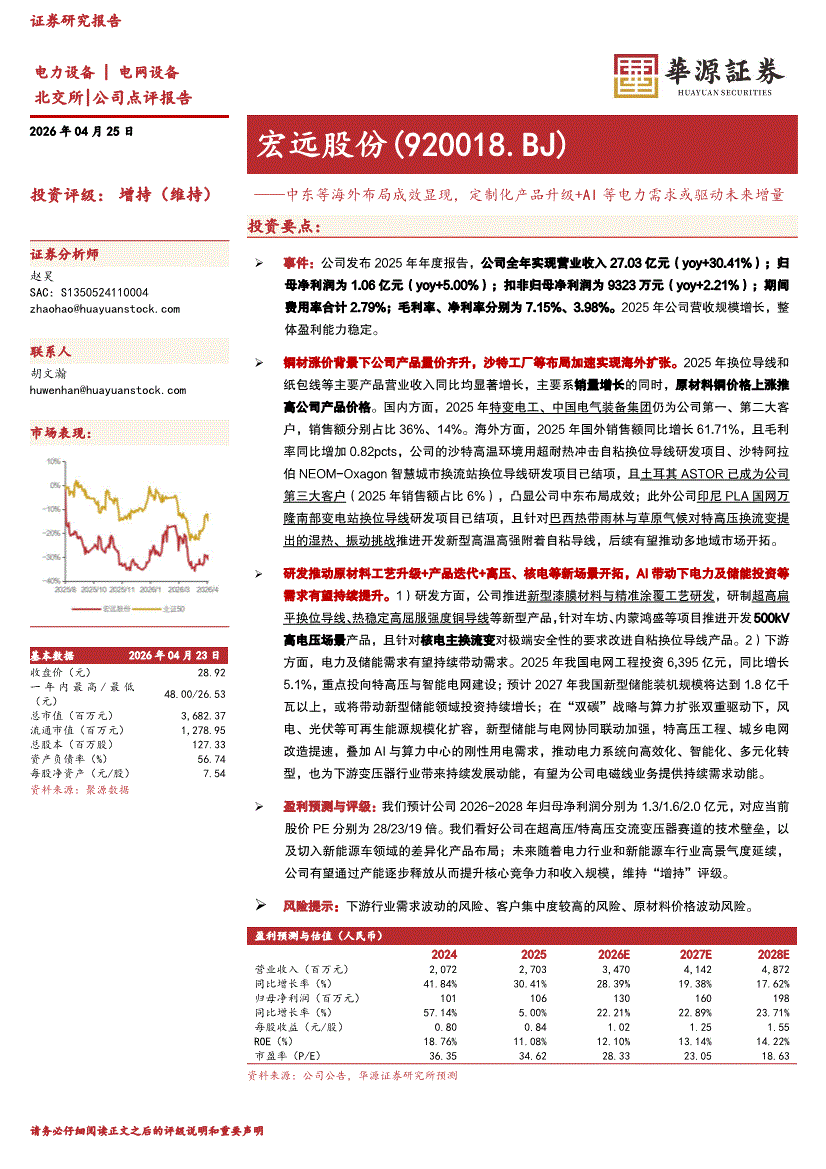 宏远股份:华源证券-宏远股份-920018-中东等海外布局成效显现,定制化产品升级+AI等电力需求或驱动未来增量-260425