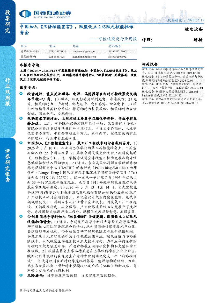 可控核聚变行业:国泰海通证券-可控核聚变行业周报:中国加入《三倍核能宣言》,欧盟设立2亿欧元核能担保资金-260315