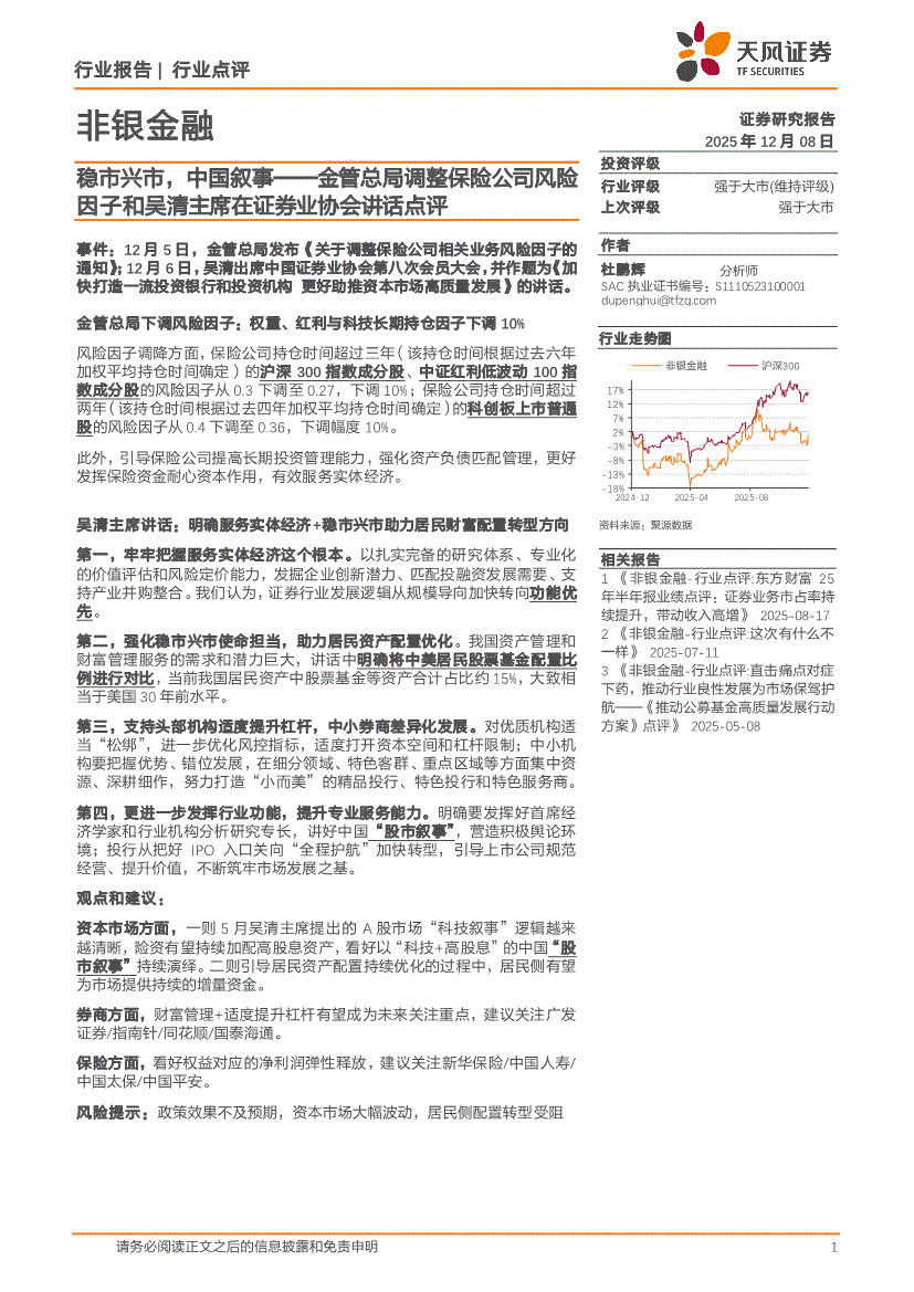 非银金融行业:天风证券-非银金融行业:稳市兴市,中国叙事——金管总局调整保险公司风险因子和吴清主席在证券业协会讲话点评-251208