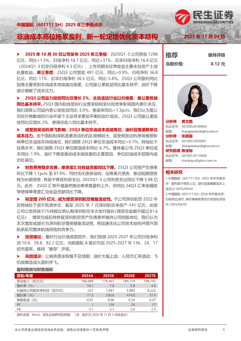 中国国航:民生证券-中国国航-601111-2025年三季报点评:非油成本高位拖累盈利,新一轮定增优化资本结构-251104
