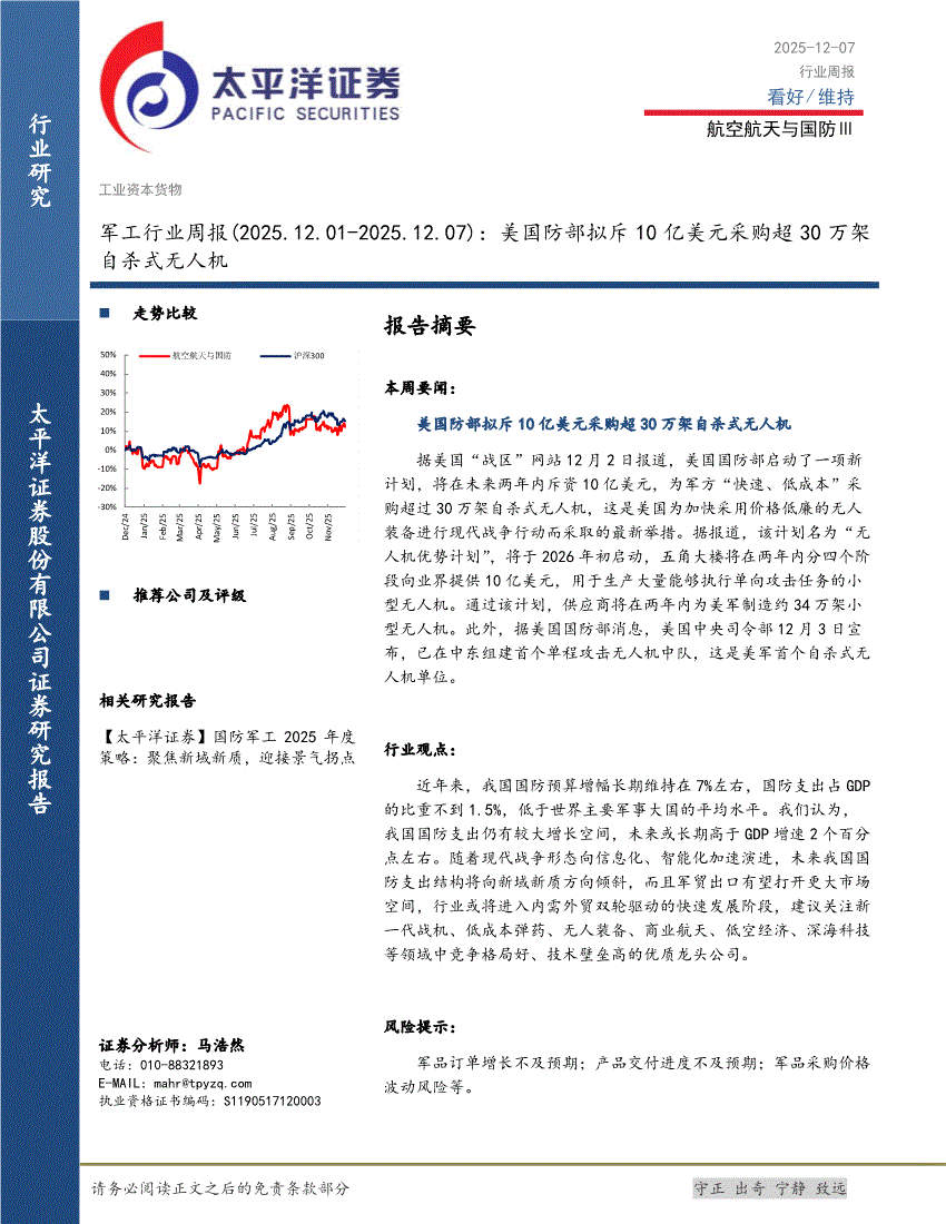 军工行业:太平洋证券-军工行业周报:美国防部拟斥10亿美元采购超30万架自杀式无人机-251207
