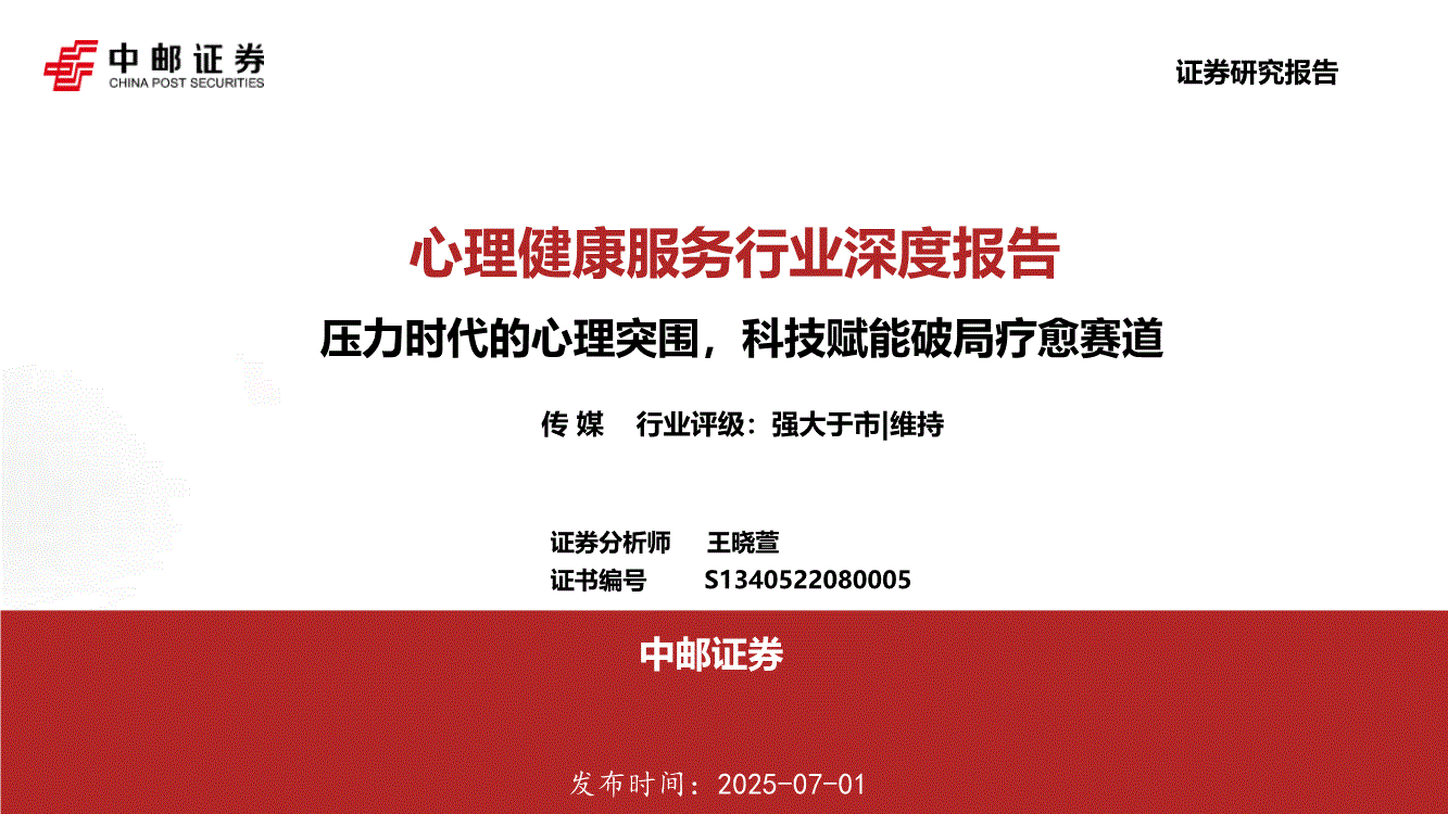 心理健康服务行业:中邮证券-心理健康服务行业深度报告:压力时代的心理突围,科技赋能破局疗愈赛道-250701