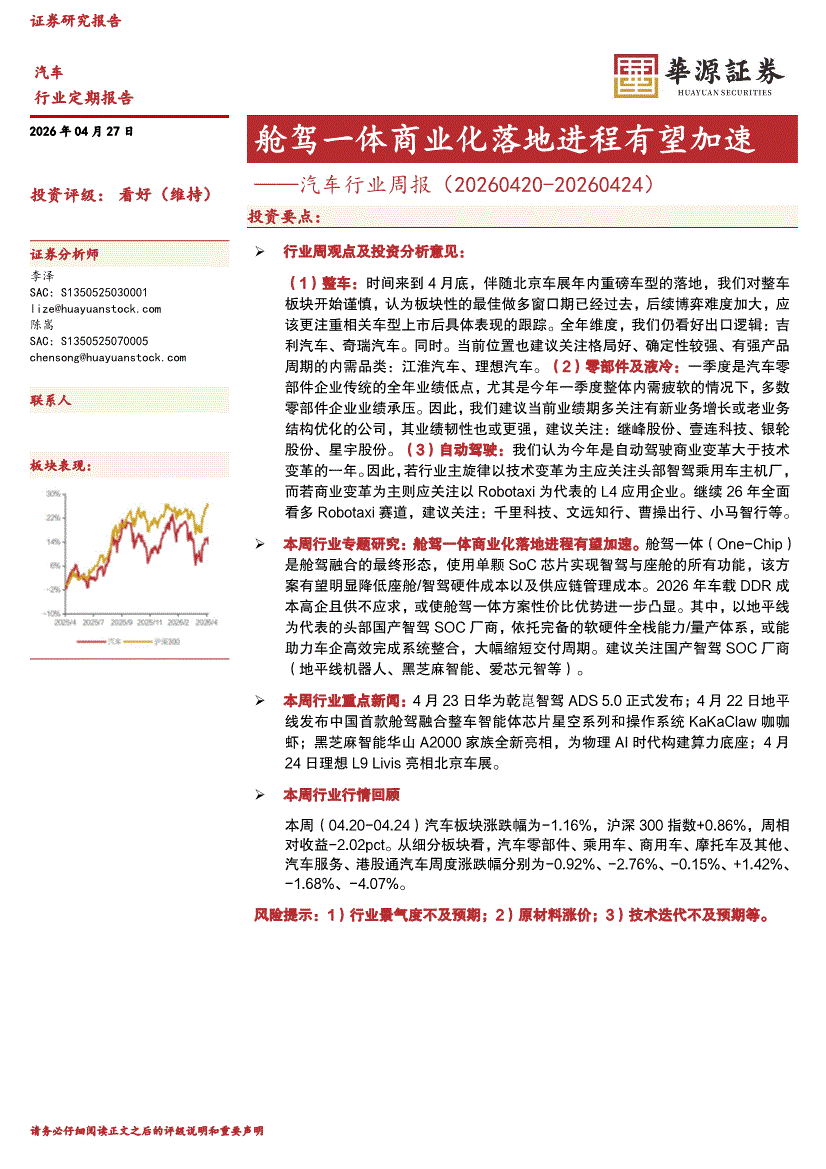汽车行业:华源证券-汽车行业周报:舱驾一体商业化落地进程有望加速-260427