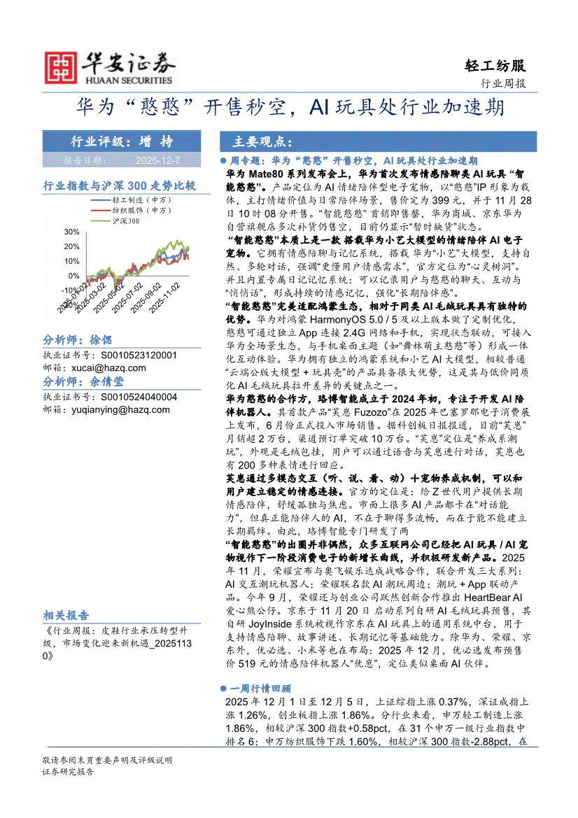 轻工纺服行业:华安证券-轻工纺服行业周报:华为“憨憨”开售秒空,AI玩具处行业加速期-251207