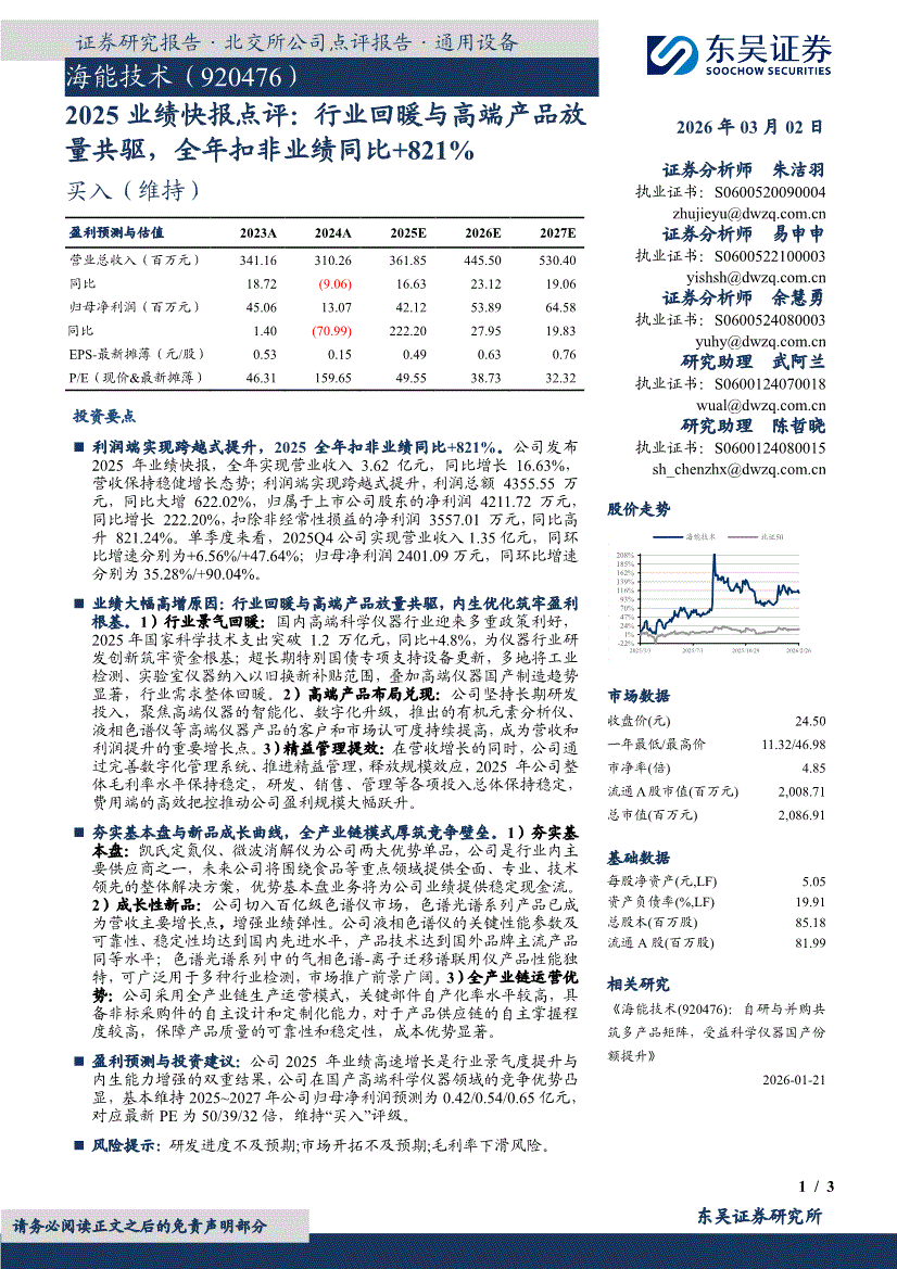 海能技术:东吴证券-海能技术-920476-2025业绩快报点评:行业回暖与高端产品放量共驱,全年扣非业绩同比+821%-260302