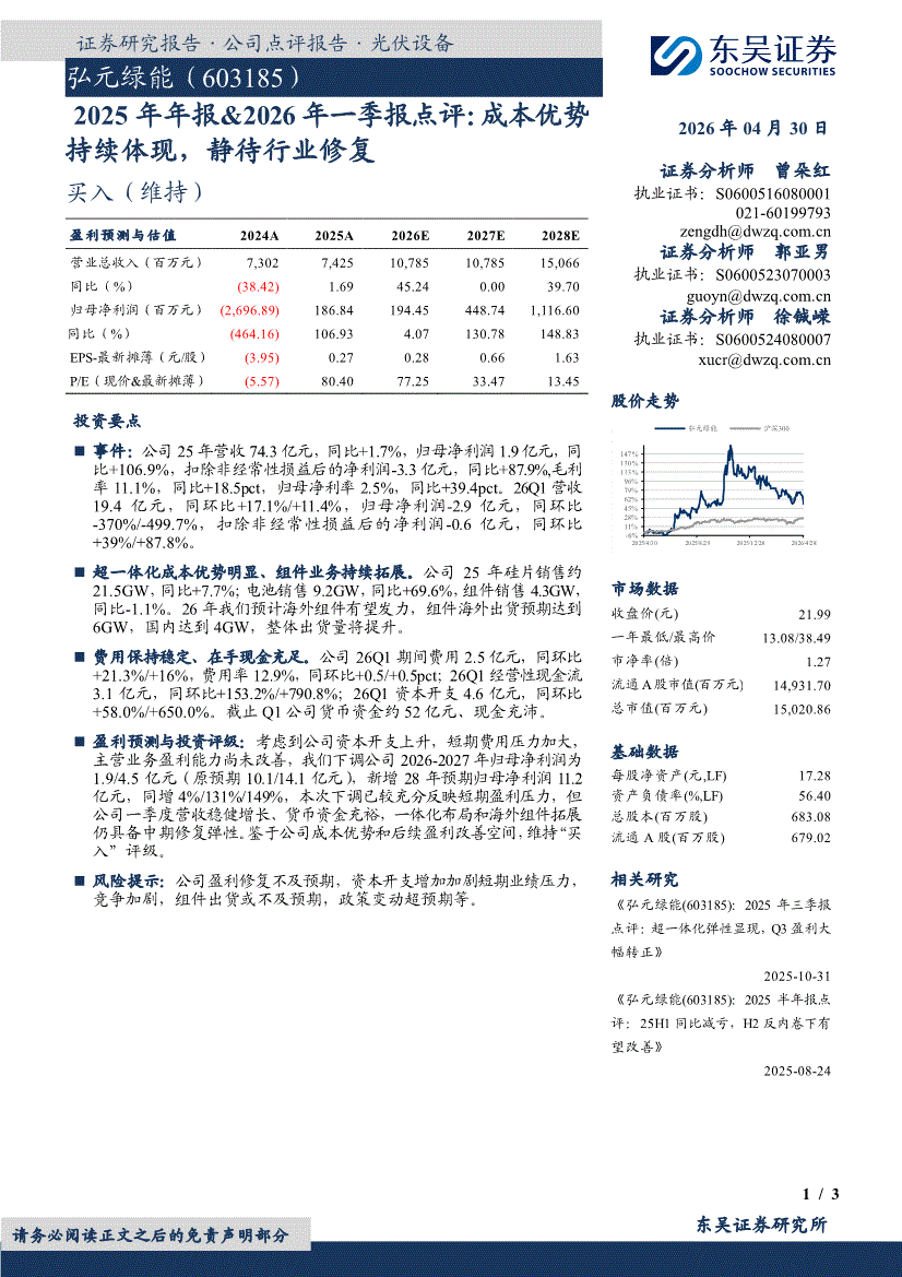 弘元绿能:东吴证券-弘元绿能-603185-2025年年报&2026年一季报点评:成本优势持续体现,静待行业修复-260430