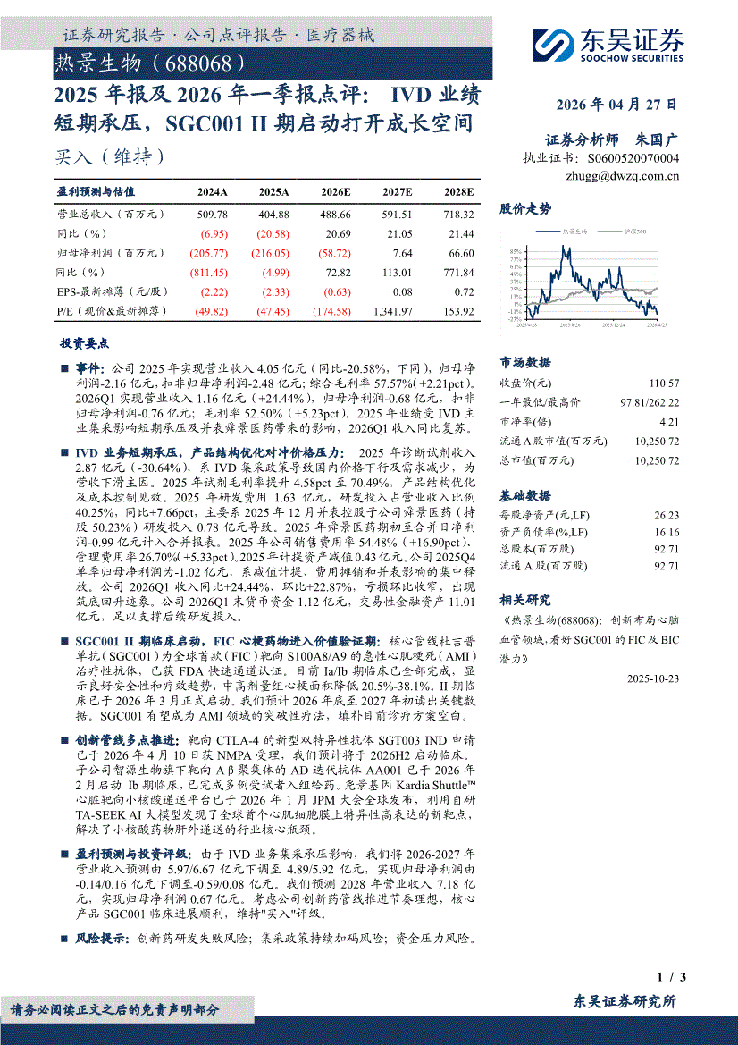 热景生物:东吴证券-热景生物-688068-2025年报及2026年一季报点评:IVD业绩短期承压,SGC001 II期启动打开成长空间-260427