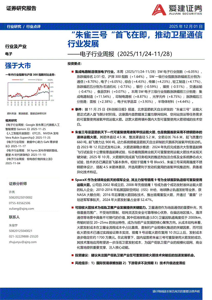 电子行业:爱建证券-电子行业周报:“朱雀三号“首飞在即,推动卫星通信行业发展-251201