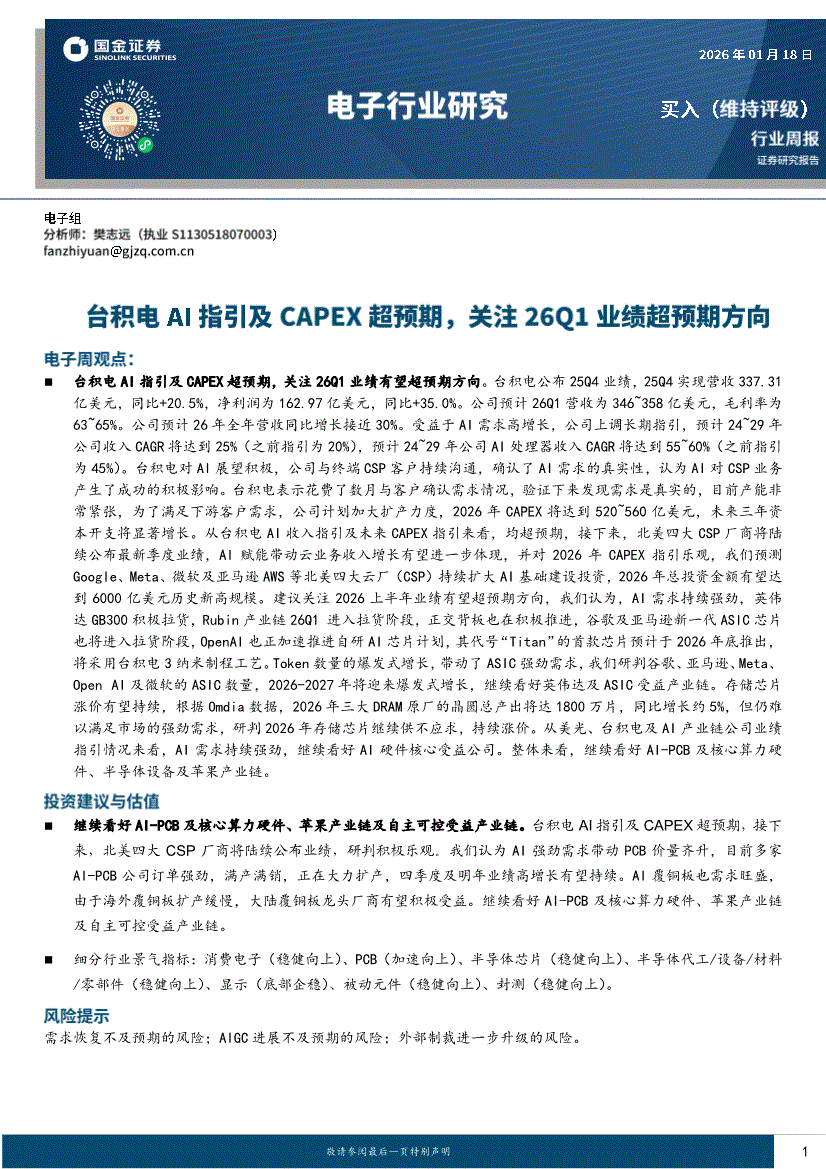 电子行业:国金证券-电子行业周报:台积电AI指引及CAPEX超预期,关注26Q1业绩超预期方向-260118