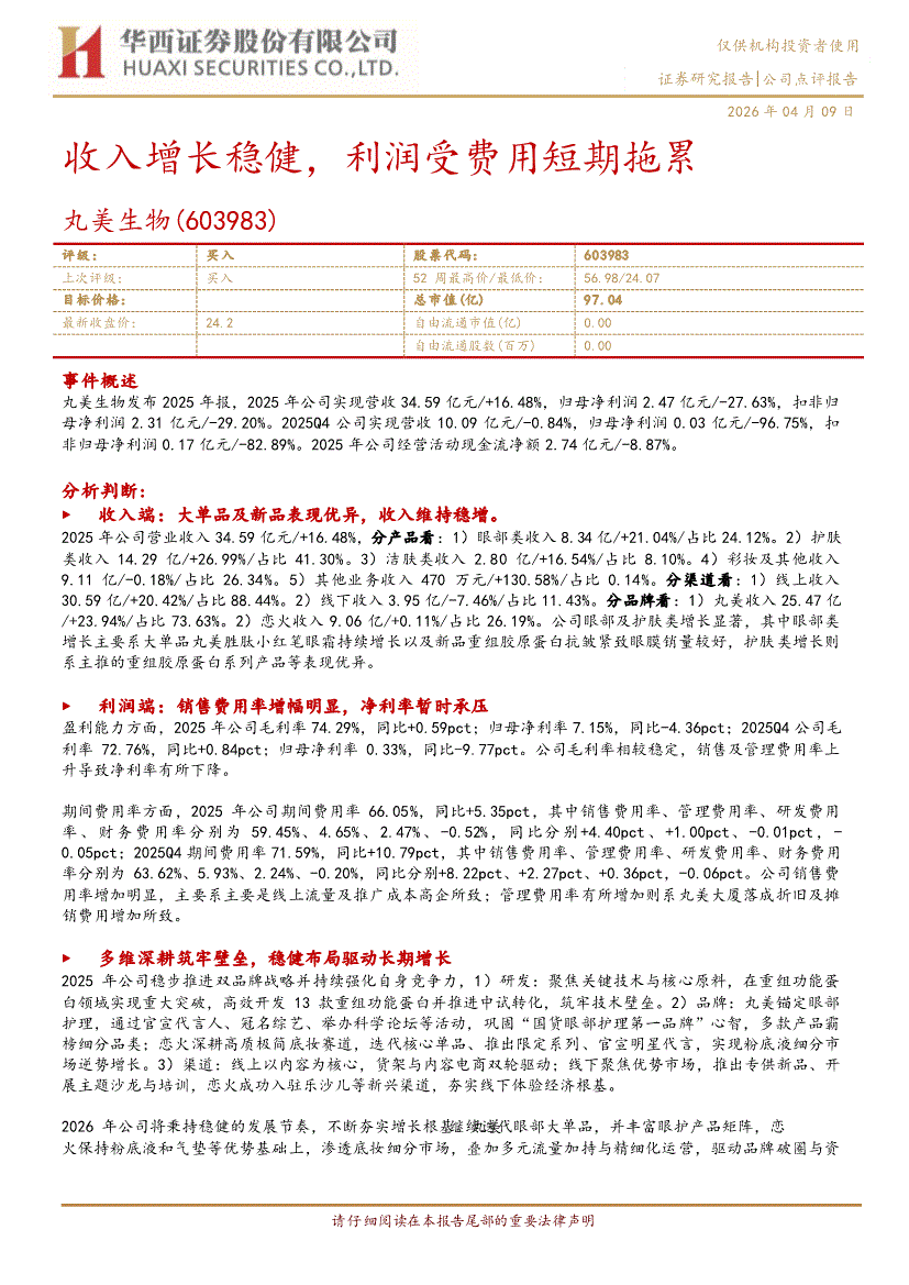 丸美生物:华西证券-丸美生物-603983-收入增长稳健,利润受费用短期拖累-260409