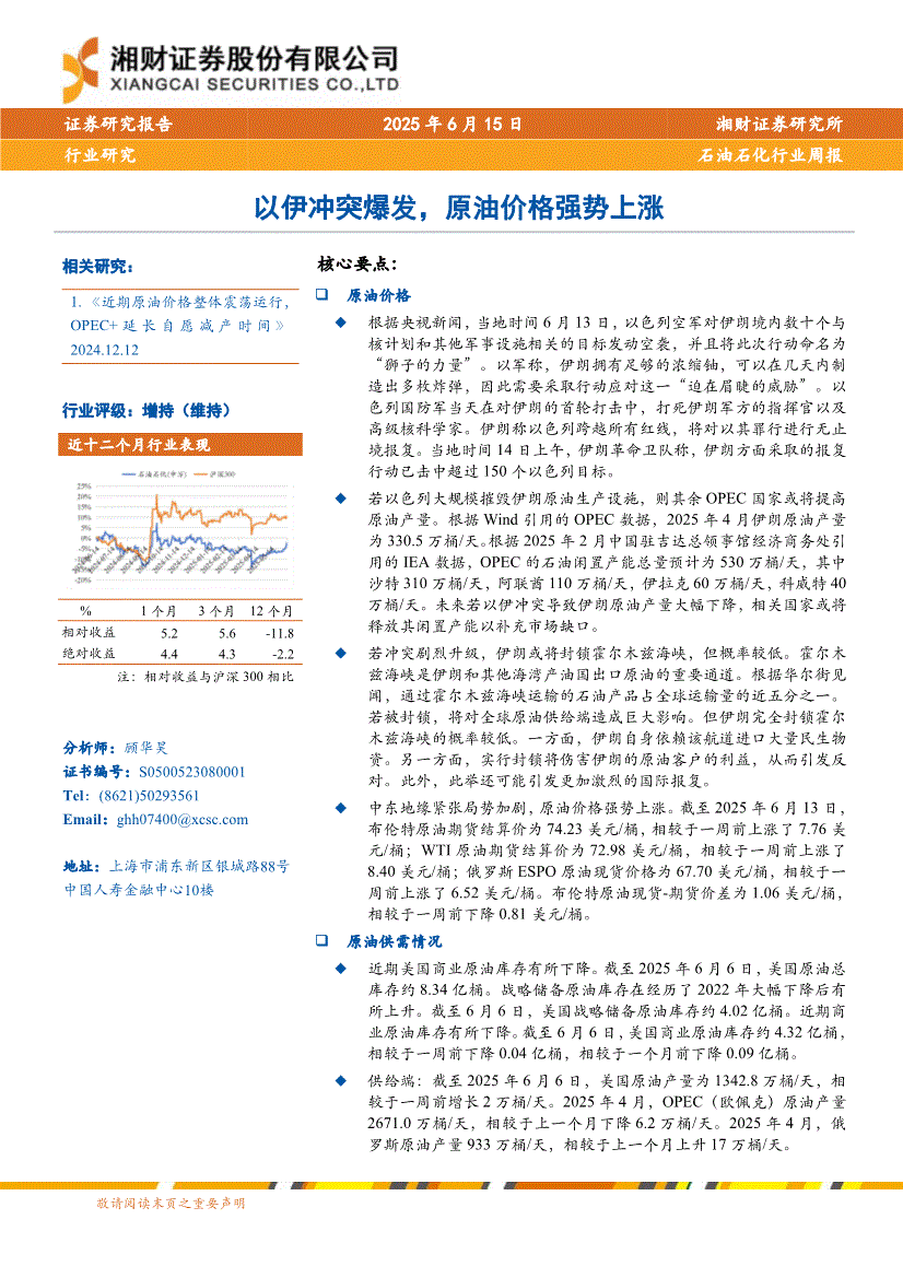 石油石化行业:湘财证券-石油石化行业周报:以伊冲突爆发,原油价格强势上涨-250615