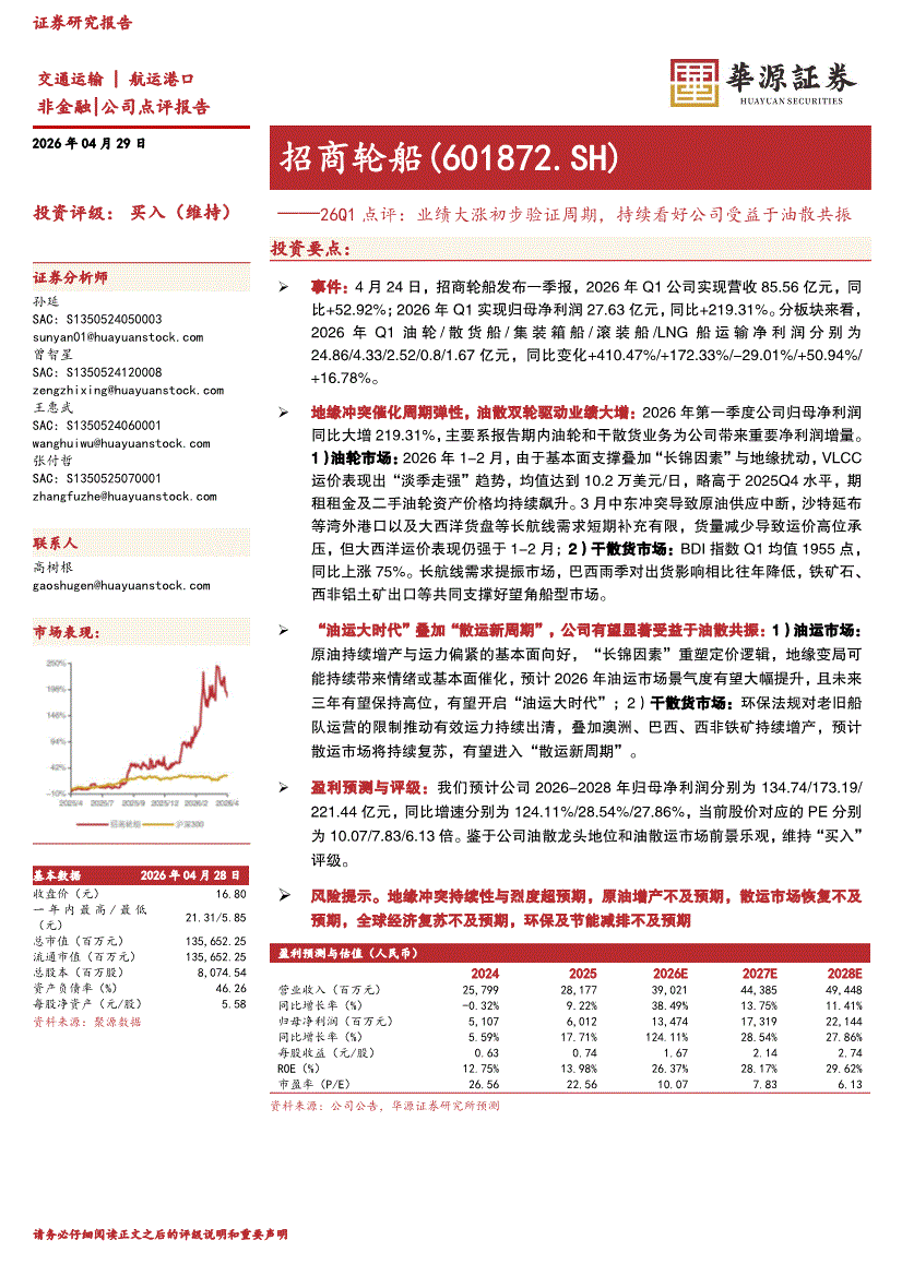 招商轮船:华源证券-招商轮船-601872-26Q1点评:业绩大涨初步验证周期,持续看好公司受益于油散共振-260429