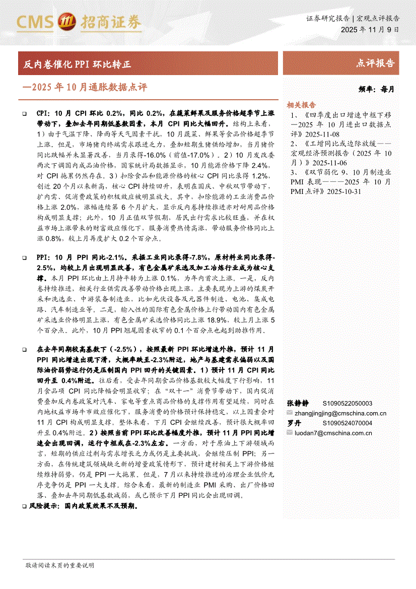 招商证券-2025年10月通胀数据点评:反内卷催化PPI环比转正-251109