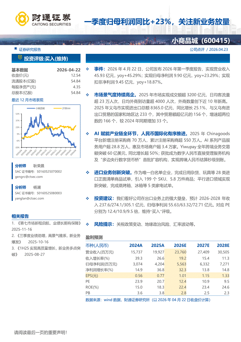 小商品城:财通证券-小商品城-600415-一季度归母利润同比+23%,关注新业务放量-260423