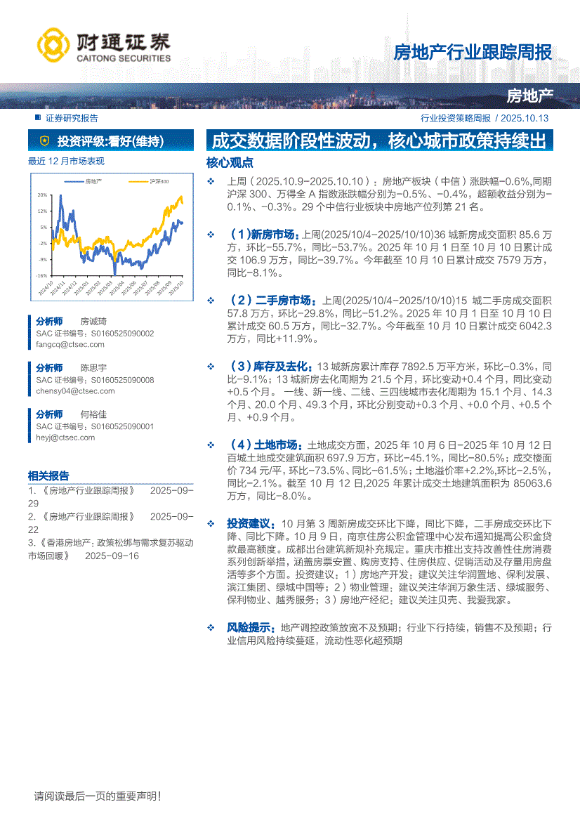 房地产行业:财通证券-房地产行业跟踪周报:成交数据阶段性波动,核心城市政策持续出-251013