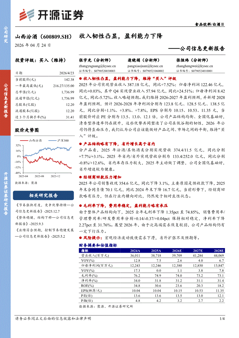 山西汾酒:开源证券-山西汾酒-600809-公司信息更新报告:收入韧性凸显,盈利能力下降-260424