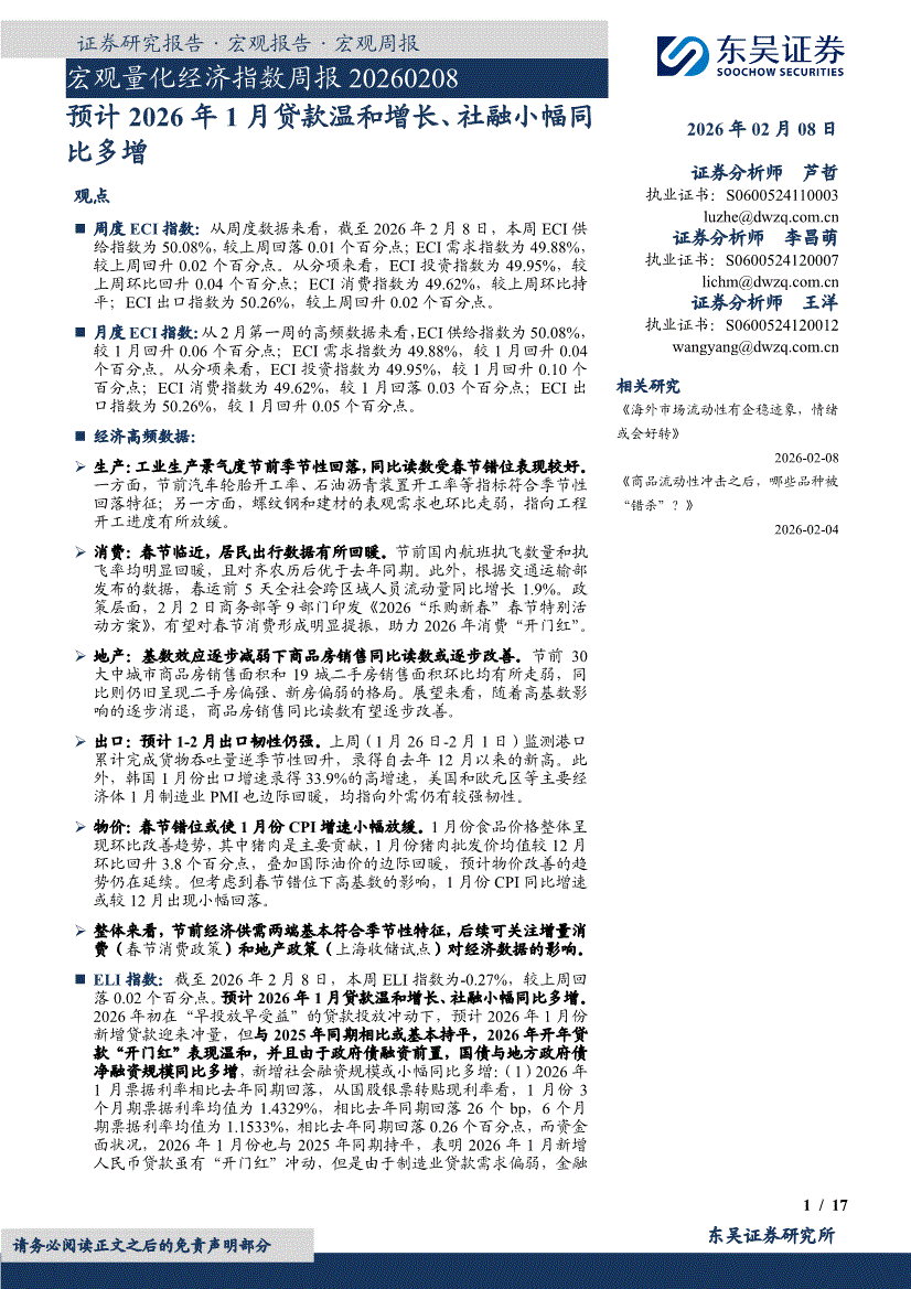 东吴证券-宏观量化经济指数周报:预计2026年1月贷款温和增长、社融小幅同比多增-260208