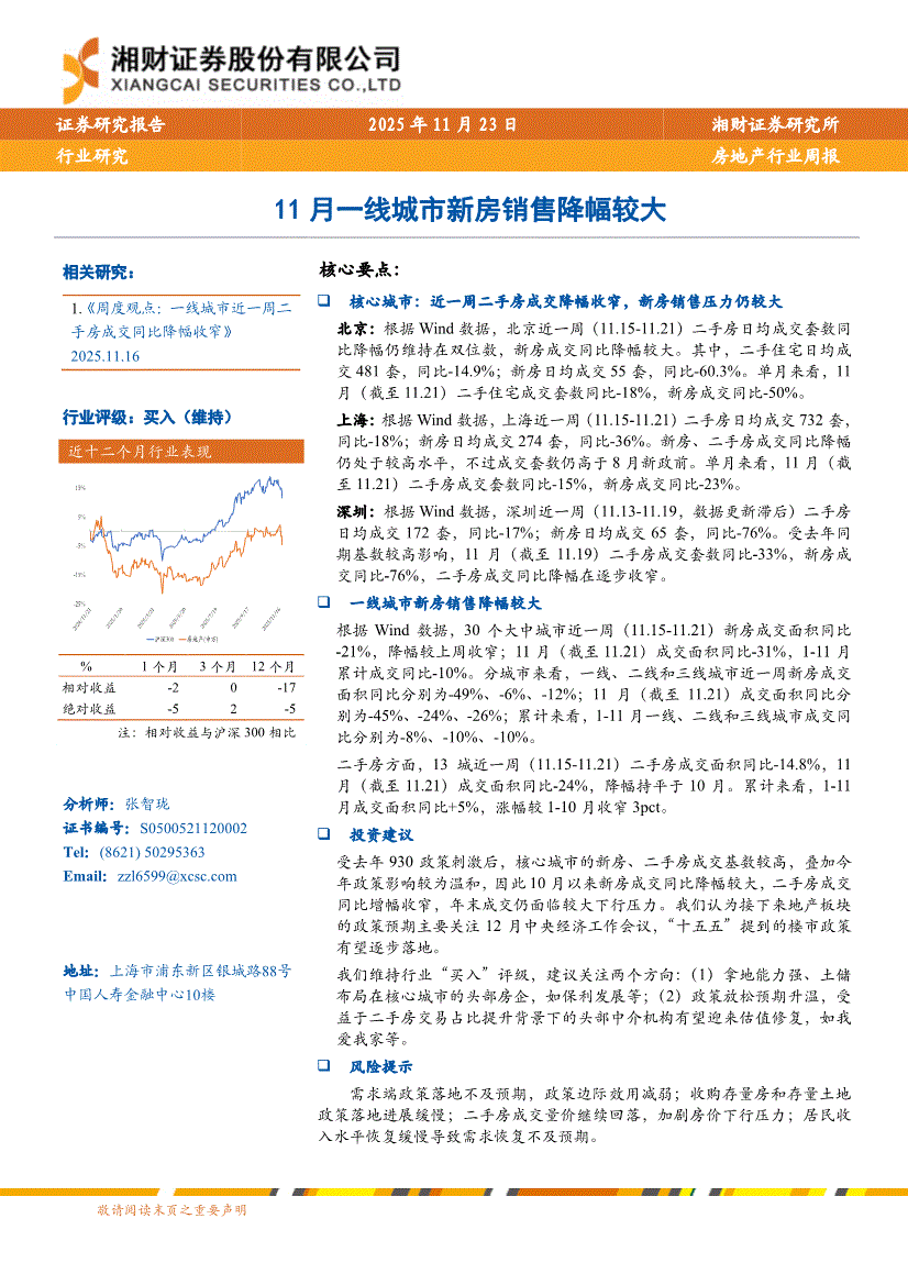房地产行业:湘财证券-房地产行业周报:11月一线城市新房销售降幅较大-251123