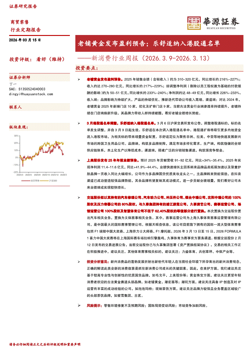新消费行业:华源证券-新消费行业周报:老铺黄金发布盈利预告;乐舒适纳入港股通名单-260315