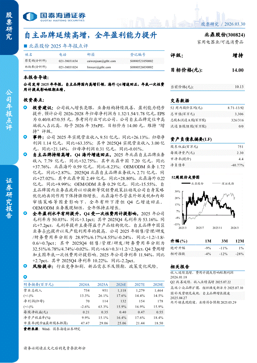 北鼎股份:国泰海通证券-北鼎股份-300824-2025年年报点评:自主品牌延续高增,全年盈利能力提升-260330