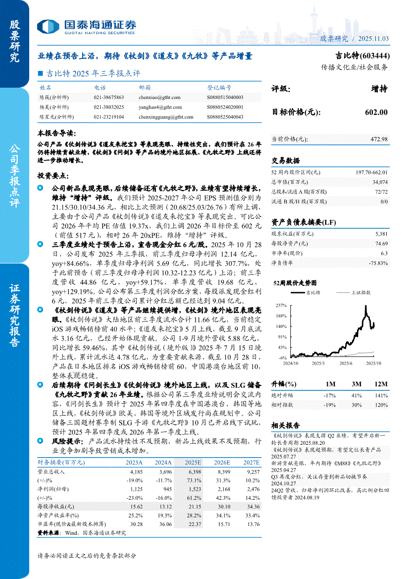 吉比特:国泰海通证券-吉比特-603444-2025年三季报点评:业绩在预告上沿,期待《杖剑》《道友》《九牧》等产品增量-251103