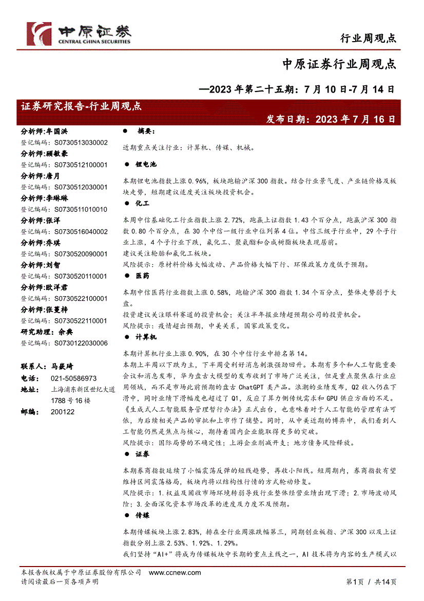 中原证券-行业周观点:2023年第二十五期,7月10日~7月14日-230716