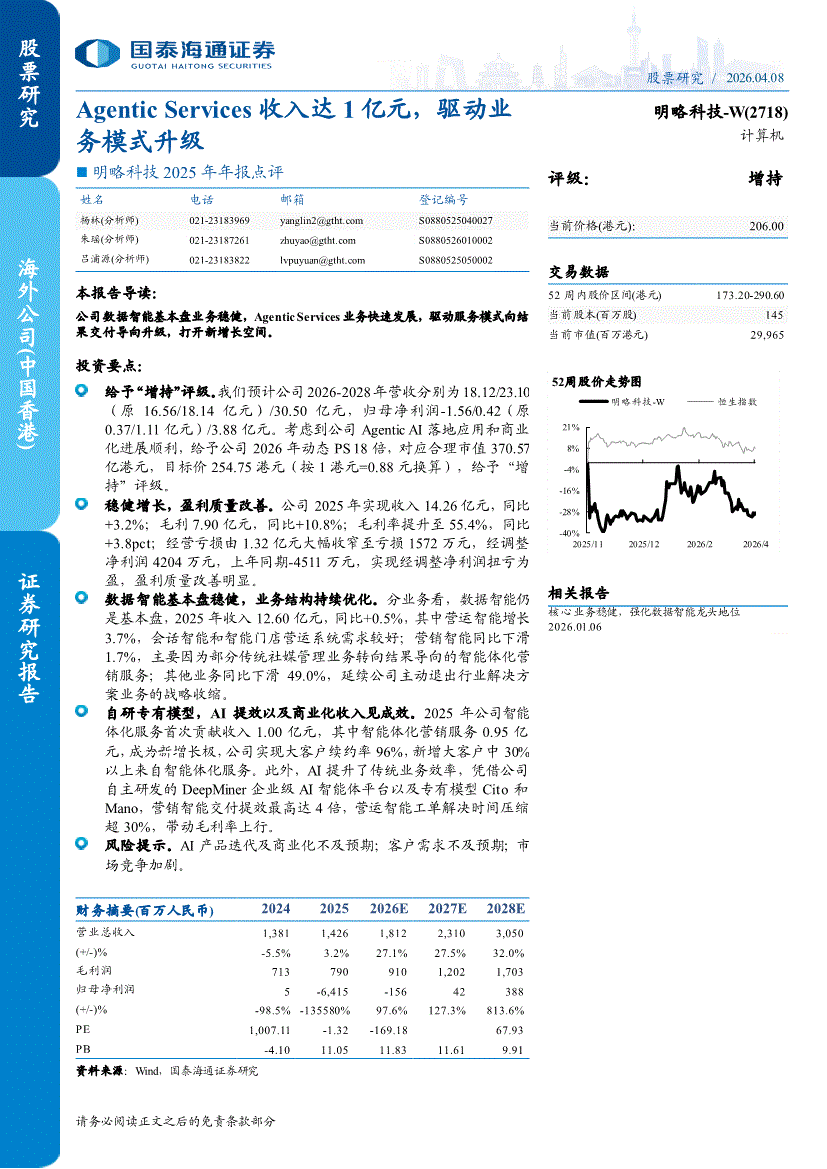 明略科技~W:国泰海通证券-明略科技~W-2718.HK-2025年年报点评:Agentic Services收入达1亿元,驱动业务模式升级-260408