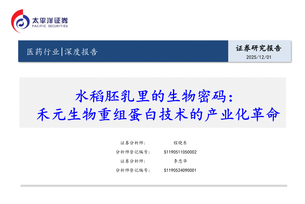 医药行业:太平洋证券-医药行业水稻胚乳里的生物密码:禾元生物重组蛋白技术的产业化革命-251201