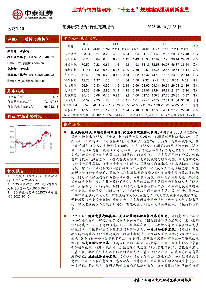 医药生物行业:中泰证券-医药生物行业:业绩行情持续演绎,“十五五”规划继续强调创新发展-251026