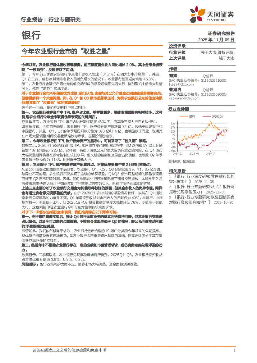 银行业:天风证券-银行业:今年农业银行金市的“取胜之匙”-251109