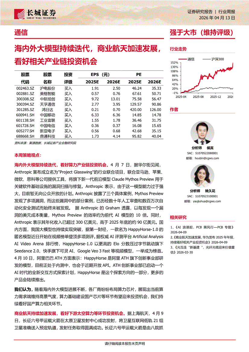 通信行业:长城证券-通信行业周报:海内外大模型持续迭代,商业航天加速发展,看好相关产业链投资机会-260413