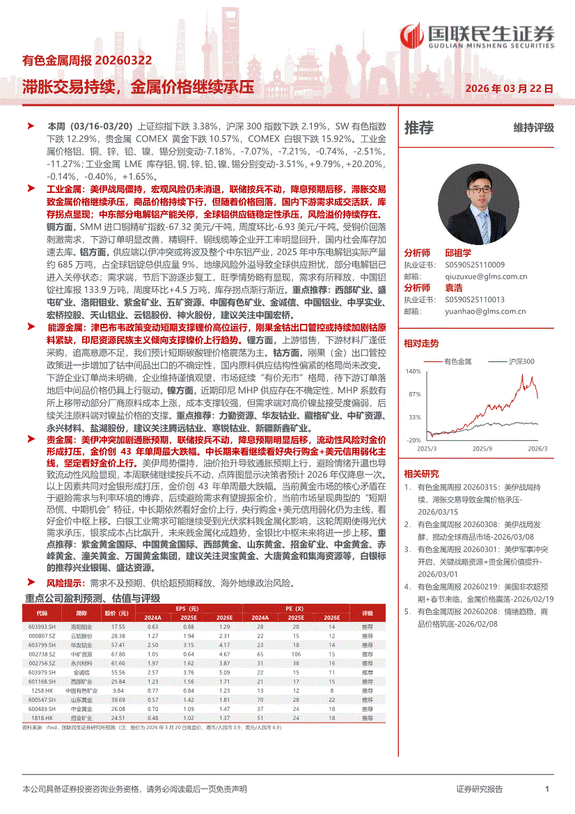 有色金属行业:国联民生证券-有色金属行业周报:滞胀交易持续,金属价格继续承压-260322