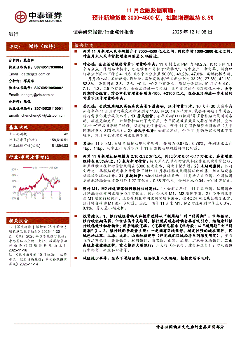 银行业:中泰证券-银行业11月金融数据前瞻:预计新增贷款3000~4500亿,社融增速维持8.5%-251208