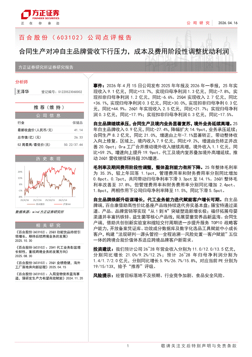 百合股份:方正证券-百合股份-603102-公司点评报告:合同生产对冲自主品牌营收下行压力,成本及费用阶段性调整扰动利润-260416