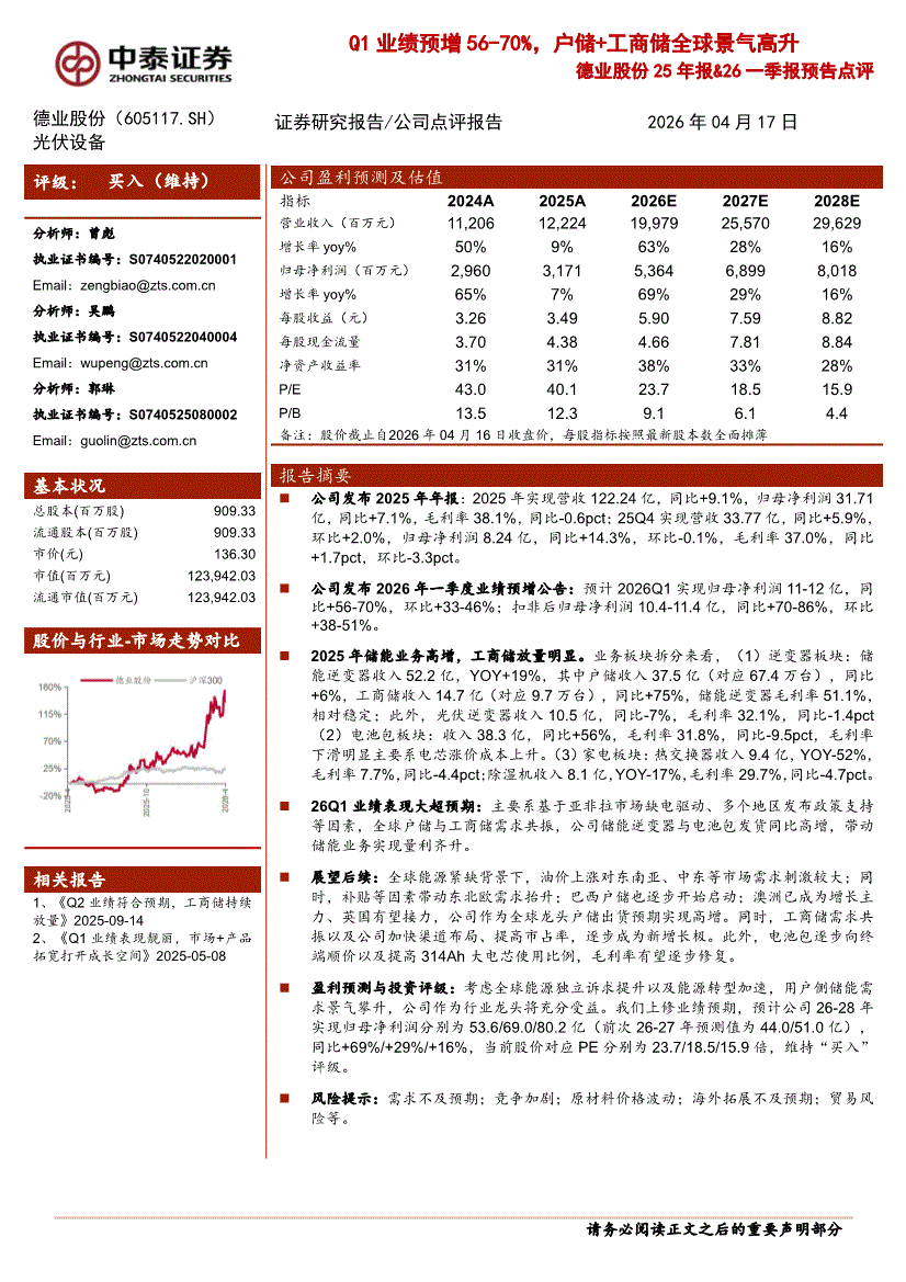 德业股份:中泰证券-德业股份-605117-25年报&26一季报预告点评:Q1业绩预增56~70%,户储+工商储全球景气高升-260417