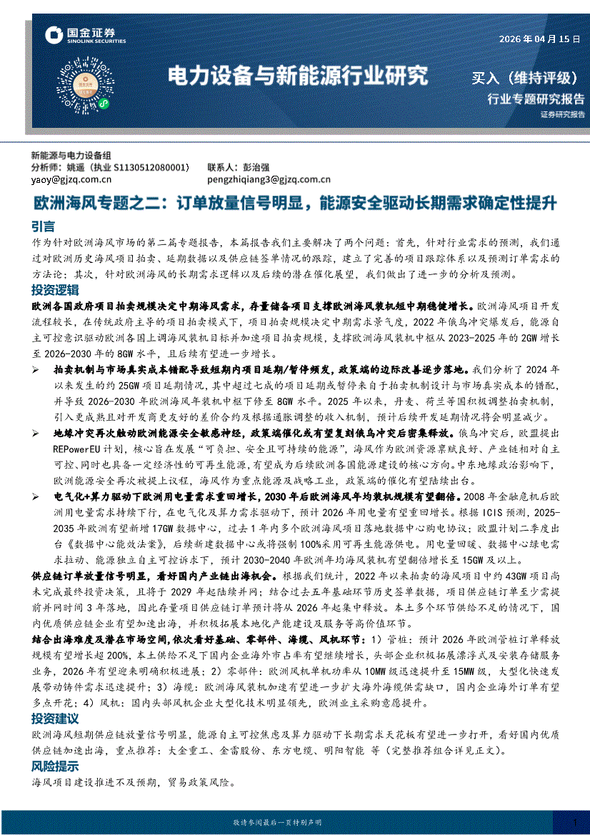 电力设备与新能源行业:国金证券-电力设备与新能源行业欧洲海风专题之二:订单放量信号明显,能源安全驱动长期需求确定性提升-260415
