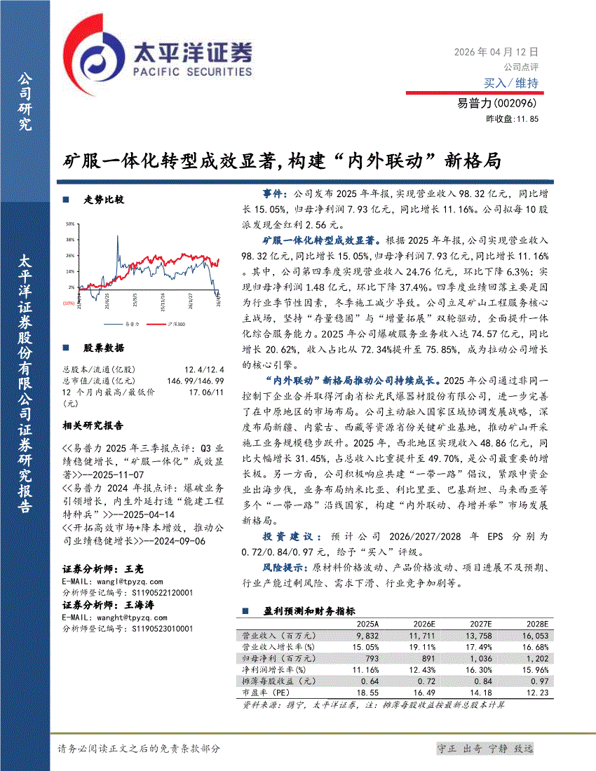 易普力:太平洋证券-易普力-002096-矿服一体化转型成效显著,构建“内外联动”新格局-260412