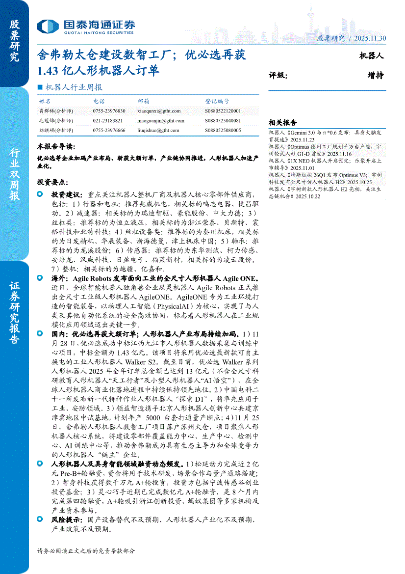 机器人行业:国泰海通证券-机器人行业周报:舍弗勒太仓建设数智工厂;优必选再获1.43亿人形机器人订单-251130