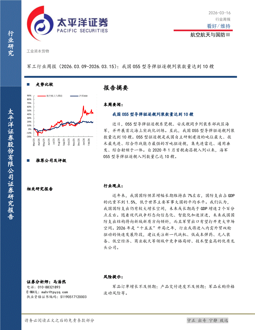 军工行业:太平洋证券-军工行业周报:我国055型导弹驱逐舰列装数量达到10艘-260316